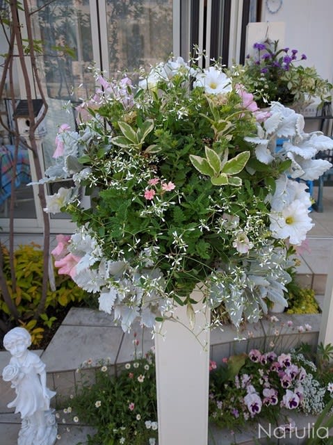 ユーフォルビアが柔らかなやさしさをつくってくれました。これから咲くたくさんのペチュニアとバーベナで。成長が楽しみです。